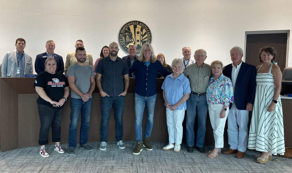 Mr. Eager, a musician based in Greenville whose wife grew up in Simpsonville, premiered “Simpsonville (Simply Home)” at the 6th Annual Simpsonville Tree Lighting Ceremony in December, accompanied by the Hillcrest High School student choir Ram Voices led by Holly Hill. In the spring, Mr. Eager and his musicians produced a music video, in part funded by local businesses Integrity Animal Health Group and 1885 and discretionary funds from the City. Mr. Hutchings partnered with Mr. Eager to support the project before suggesting that the City adopt “Simpsonville (Simply Home)” as its official anthem.